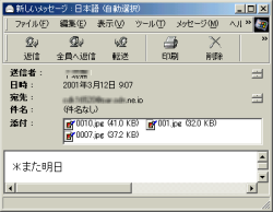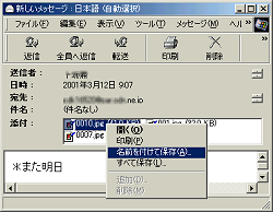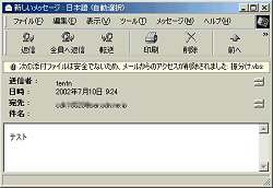 ■クリップのマークのあるメールに添付ファイルがあります。 ■ダブルクリックします。 このとき感染の恐れのある添付ファイルだった場合は、保護機能が働き感染から保護されます。 ウィルス駆除ソフトをインストールしている場合は、ウィルス駆除ソフトによっても保護されます。 ただし、ウィルス駆除ソフトの設定に依存することになります。 |