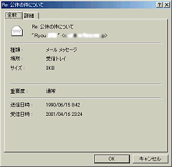 | Date | 曜日、月、西暦、時:分:秒 +0900で表示されます。 +0900とは、グリニッジ標準時から9時間進んでいることを表します。 送信元のコンピュータの日時指定が間違っていると、間違った時間を記録してメールを送信してしまいます。 |