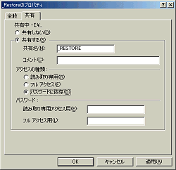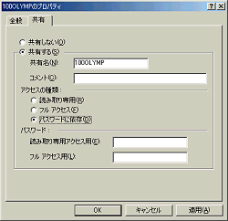 ![]() | ■ プロパティ [共有する]にチェック ■ アクセスの種類 読み取り専用 外部からの接続に対して読み込みのみ可能。 フルアクセス 外部からの接続に対して読み込み、書き込みが可能。 パスワードに依存 パスワードによってアクセス権を変更 |