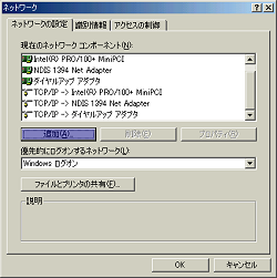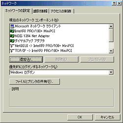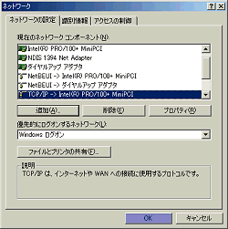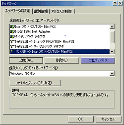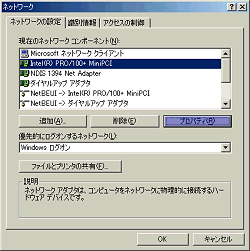 ![]() | ■ ネットワーク LANで使用されるアダプタ を選択します。私のPCでは、 Intel(R)PRO/100+MiniPCIになっています。機種によって違います。[プロパティ]をクリック |