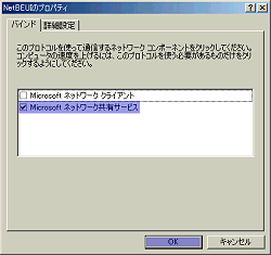 ![]() | ■ NetBEUIのプロパティ [バインド]にて[Microsoftネットワーク共有サービス]にチェックが入っていることを確認します。 [OK]をクリック |