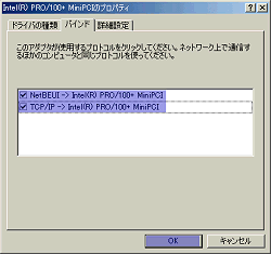 ![]() | ■ Intel(R)PRO/100+MiniPCIのプロパティ [バインド]タブのバインド状況を確認します。 NetBEUI->あなたのLANアダプタ(私のPCではIntel(R)PRO/100+MiniPCI)にチェックが入っていることを確認します。 [OK]をクリック 注意:TCP/IPのバインドのチェックははずさないこと。インターネット接続に利用されています。 |