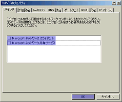 ![]() | ■ TCP/IPのプロパティ [バインド]タブをクリック [Microsoftネットワーククライアント][Microsoftネットワーク共有サービス]のチェックをはずします。 [OK]をクリック |