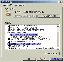 ■ フォルダオプション [表示]タブをクリック [すべてのファイルとフォルダを表示する]にチェック [登録されているファイルの拡張子は表示しない]のチェックをはずします。 [適用]をクリック [OK]をクリック |