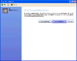■削除しようとするアカウント(ユーザ)のマイドキュメント内のフォルダ、ファイルは削除されてしまいます。 記念写真等の大切なファイル、データは残っていませんか? [ファイルの保存]をクリックすれば、マイドキュメント内のファイルは保存されます。 ■[ファイルの削除]をクリック! |